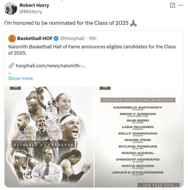 其中,七冠成員羅伯特-霍里在列。對此,他轉推評論道:“我很榮幸能夠提名2025屆奈史密斯名人堂。”